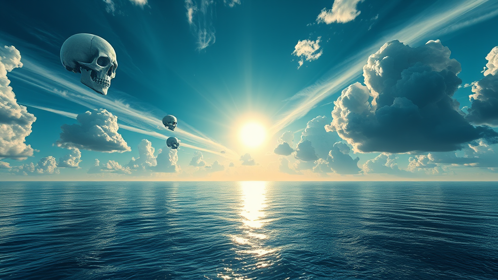 A breathtaking seascape where the sky merges realism with fantastical elements, featuring intricate skull motifs subtly woven into cloud formations. Brilliant light shimmers across the water, casting surreal reflections that dance like ethereal spirits. The scene feels like a journey through a majestic realm that defies belief in its beauty. Echoes of transavanguardia art style infuse the landscape, bringing together the unexpected and the visionary, as if sculpted in ZBrush. An awe-inspiring view that evokes the urge to explore, transcending the boundaries of the known world.