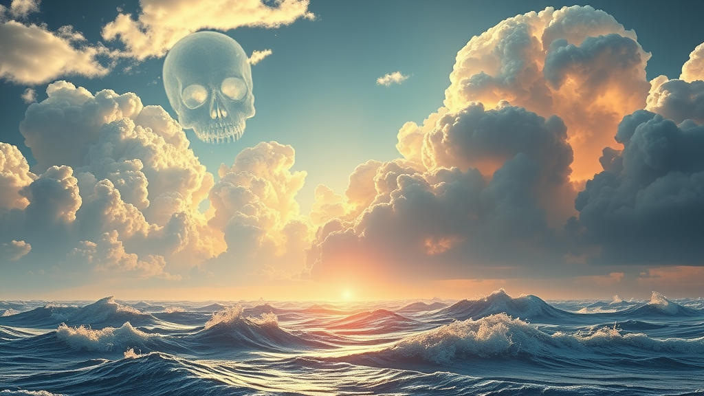A breathtaking skyscape blends realism with fantasy as luminous clouds form intricate skull motifs against a light-filled seascape, where each wave seems sculpted in exquisite detail akin to ZBrush artistry. The scene evokes a sense of wanderlust, as if traveling through a Transavanguardia dream, each element harmoniously contributing to a vision so stunning it's almost unbelievable.