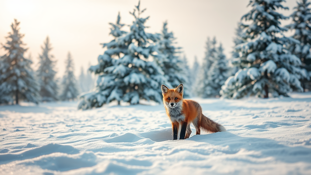 A breathtaking snowy landscape unfolds, where the ground is blanketed in pristine, untouched snow, glistening under the soft, cinematic lighting of a serene, pale winter sky. The scenery is brought to life with highly detailed elements—a cluster of frosted fir trees stands majestically in the foreground, their branches gently drooping under the weight of fresh snow. In the center, a playful red fox with wide, endearing eyes looks inquisitively towards you, its fur a vivid contrast against the wintry background. The scene is captured with the clarity of an 8k resolution, and the depth of a 50mm lens, emphasizing the crisp texture of the snow and the delicate features of the curious fox. The overall composition has a warm, inviting glow, evoking a sense of wonder and tranquility in this beautifully rendered, enchanting winter scene.