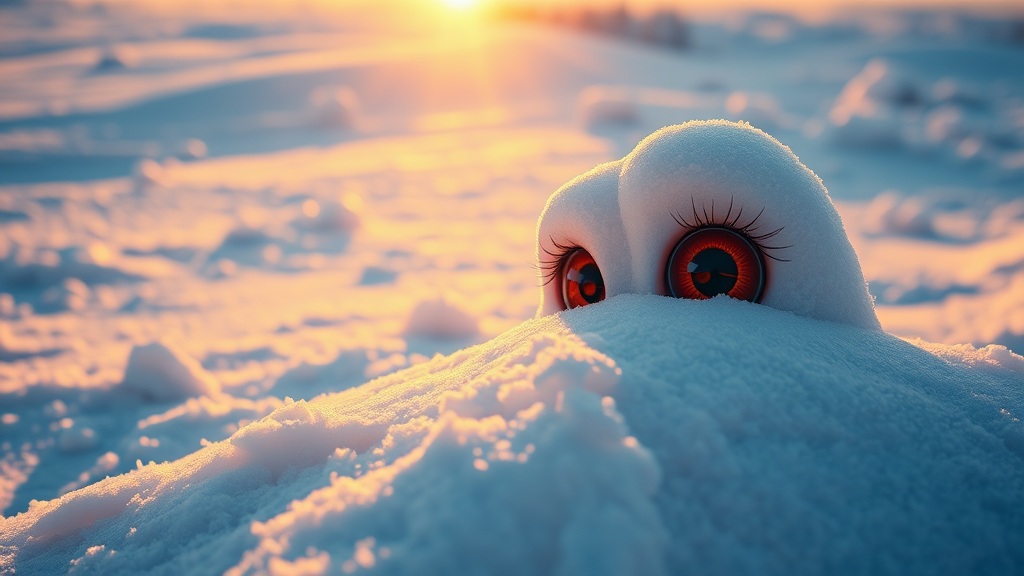 A breathtaking snowy landscape unfolds with enchanting, large cute eyes in the forefront, their expression mirroring the serene beauty of the scene. The snow glistens under the golden hour sunlight, revealing intricate details in stunning 8k resolution. The cinematic lighting casts gentle shadows across the landscape, highlighting the tranquil atmosphere. This highly detailed image, captured through the perspective of a 50mm lens with octane rendering, adds a subtle warmth to the icy vista, inviting a sense of wonder and tranquility.