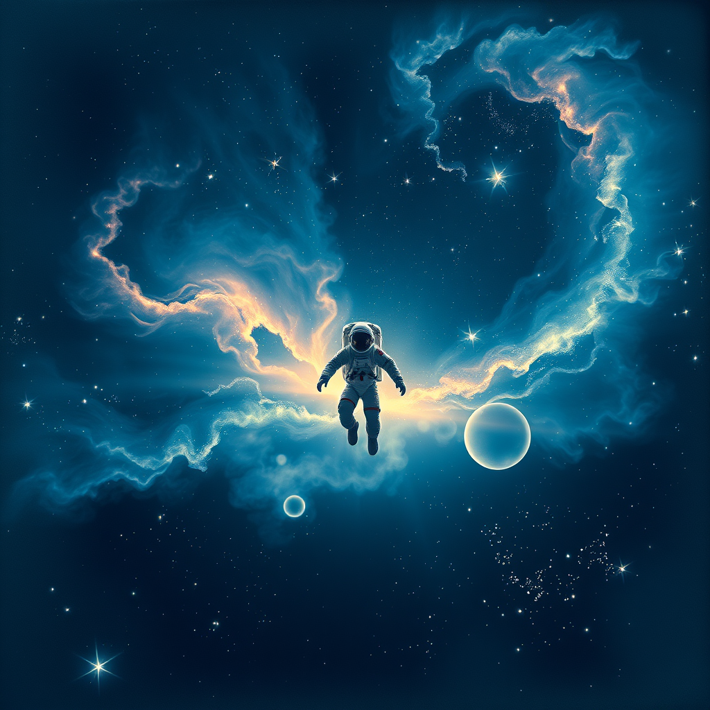 A breathtaking space-themed artwork capturing the ethereal beauty of swirling nebulas and shimmering stars, featuring an astronaut in a dark blue palette, with a focus on the stunning interplay of light and color. The scene evokes a sense of wonder and exploration as the astronaut drifts amidst the cosmic wonders, with elements that give it an out-of-frame feel, portraying limitless possibilities. The image quality reflects a vintage charm, with subtle blur and nostalgic touches reminiscent of old photographs, creating an atmosphere of timeless discovery.