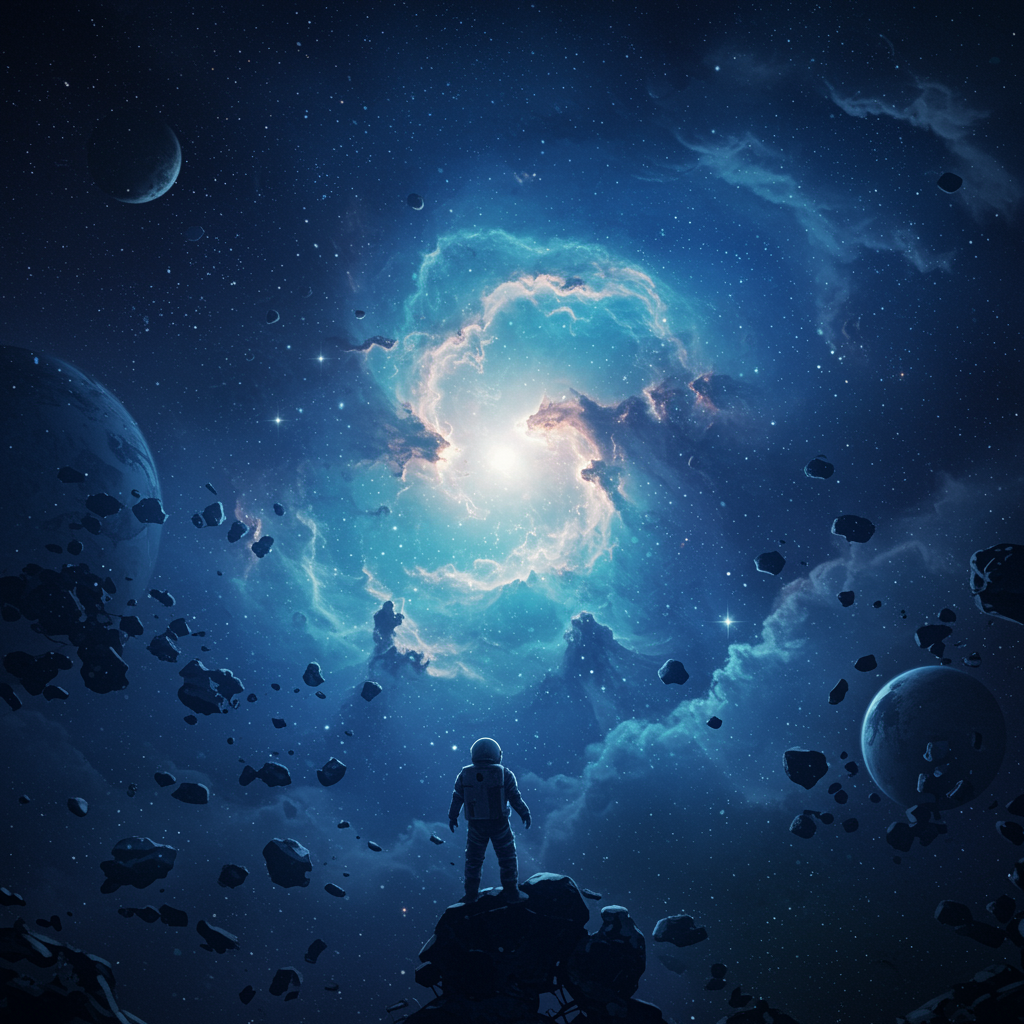 A breathtaking space-themed artwork showcasing the mesmerizing beauty of swirling nebulas and shimmering stars, with an astronaut heroically poised amidst the celestial wonders. The scene is enveloped in deep blue tones, creating a mystical atmosphere. Some elements appear slightly out of frame, adding intrigue, while subtle variations soften certain areas. The artwork's details retain a dreamlike quality, evoking a sense of endless exploration.