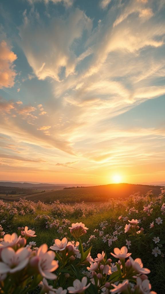 A breathtaking spring landscape unfolds in cinematic splendor, captured in 8k resolution with exquisite detail and realism, reminiscent of an octane render. The scene is adorned with a vibrant array of blooming flowers, their colors a harmonious blend of pastels and creams. The sky above is a tapestry of soft, wispy clouds illuminated by the gentle golden hues of a setting sun, casting a warm glow over the idyllic countryside. Lush greenery envelops the landscape, with delicate petals dancing in a gentle breeze, creating a serene and enchanting atmosphere that invites you to immerse yourself in the beauty of nature.