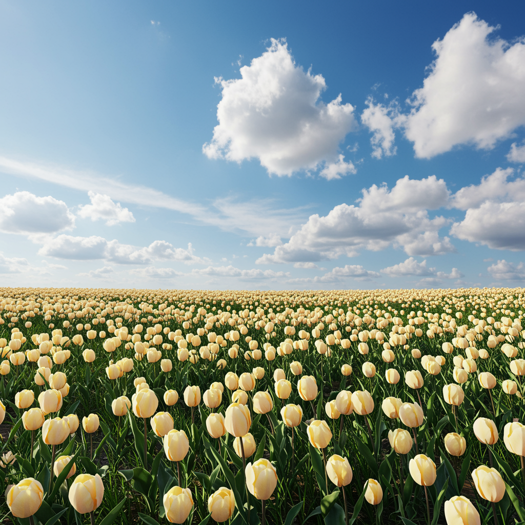 A breathtaking spring landscape unfolds in cinematic splendor, captured in stunning 8k resolution. The scene is vibrant and lifelike, resembling an octane render with intricate details. A sea of blooming flowers stretches across the field, their petals painted in soft cream hues, contrasting beautifully with the clear blue skies above. Gentle clouds drift lazily, casting delicate shadows on the undulating meadows. The play of light and shadow adds depth to the vista, creating an enchanting and tranquil atmosphere.