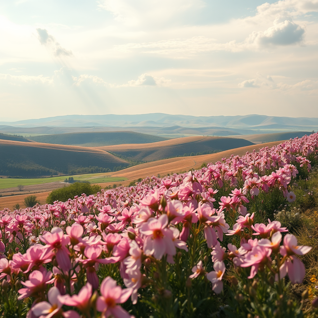 A breathtaking spring landscape unfolds with a cinematic feel, showcasing a detailed and realistic scene rendered in 8k quality. The horizon is graced with a symphony of blooming flowers in soft pastels, while vast skies stretch overhead, painted with hints of cream and subtle blush tones. Sunlight bathes the scenery in a gentle glow, casting delicate shadows that dance among the vibrant blossoms. Rolling hills in the background add depth and dimension, completing this captivating depiction of nature's renewal.