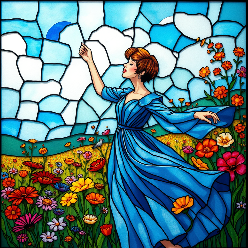 A breathtaking stained glass artwork featuring a woman with a chic pixie cut, joyfully dancing amidst a lush field of colorful flowers. Her flowing dress is a rich shade of blue, echoing a serene azure sky. The piece is a stunning portrait, accentuating a vibrant floral scene, crafted in absurd resolution. The intricate detailing and cinematic sharpness make it a true masterpiece — almost unbelievably beautiful in its execution. The scene exudes a whimsical charm, blending a cute, playful style with expertly rendered high-resolution details, capturing the essence of elegance and grace.
