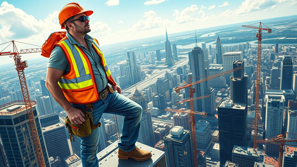 A breathtaking superhero comic book illustration in the style of Alex Ross featuring a construction worker poised atop a towering skyscraper, clad in rugged jeans, a vibrant high-vis vest, and a sturdy hard hat. The illustration showcases the iconic and realistic style of Ross, capturing every intricate detail of the worker's attire, tools, and the bustling cityscape around him. The worker's athletic build is accentuated through dynamic lines and expert shading, as he confidently gazes over the sprawling metropolis below. Intense sunlight casts dramatic shadows across his face and body, adding depth and drama to the scene. Realism is heightened by meticulous attention to detail, from the individual rivets on the worker's safety harness to the cranes and beams in the background. The entire piece is rendered in vivid hues, with a striking contrast between the bright azure sky and the steel-grey of the urban jungle. The composition is masterfully crafted, guiding the viewer's gaze from the worker’s commanding presence to the distant cityscape. This stunning illustration celebrates the heroic spirit of the everyday worker, inspiring awe and admiration.