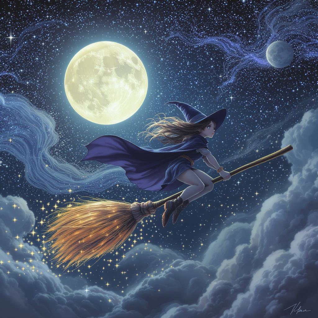 A breathtaking, ultra-detailed illustration featuring a young girl soaring through the night sky on a magical broom. The setting is a fantastical realm, where she flies solo, surrounded by a tapestry of twinkling stars, a luminous moon casting a soft glow, and wisps of clouds that dance in the windy sky. Her hair flows wildly behind her, and her cape billows dramatically, reflecting the spirit of freedom and adventurous determination. Wearing a pointed hat and sturdy boots, she expertly maneuvers her broomstick with a sense of playful skill and energy. The scene captures a blend of realism and enchantment, with vibrant colors and intricate textures that highlight the beauty and wonder of this whimsical fantasy world. This imagery evokes a connection to myths and legends, drawing from fairy tales and folklore about witches, wizards, and magical creatures. The composition is thoughtfully arranged with a captivating perspective, where the foreground showcases the girl's expressive features, the middle ground reveals the expansive sky, and the background fades into the mystery of an endless night. This artwork embodies imagination and the spirit of adventure, weaving a spellbinding narrative of beauty and wonder.