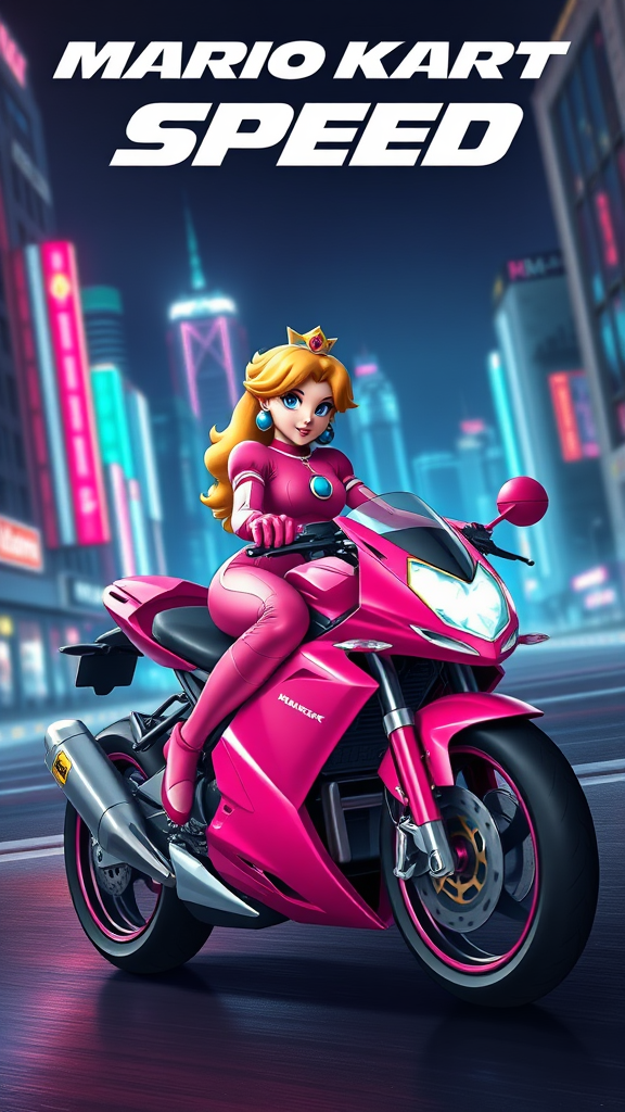 A breathtaking, ultra-realistic illustration of Princess Peach on a stylish pink Mario Kart-inspired racing bike, designed with a Fast and Furious flair. She wears a chic pink sports suit with white accents and holds a matching helmet in her right hand. The backdrop depicts a vibrant nighttime cityscape with neon lights, enveloped in a dark, fantastical atmosphere. The headline "Mario Kart SPEED" stands out at the top, adding a dramatic, cinematic touch. The high-resolution image, paired with bold typography, delivers an unforgettable visual impact.