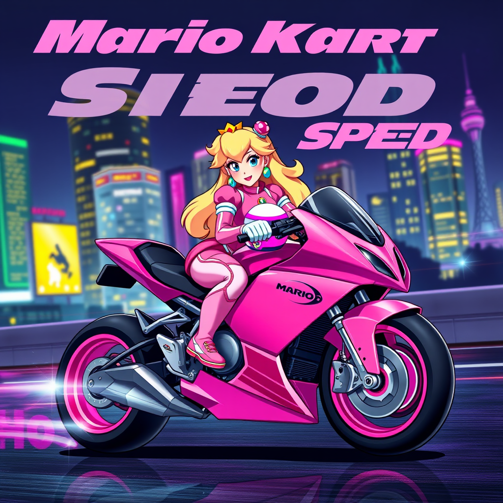 A breathtaking, ultra-realistic illustration of Princess Peach on a sleek pink racing bike inspired by Mario Kart, designed in a Fast and Furious style. She wears a chic pink sports suit with white trim and holds a matching helmet in her right hand. The backdrop is a nighttime cityscape illuminated with neon lights, exuding a dark, fantasy atmosphere. The text "Mario Kart SPEED" is prominently displayed at the top, adding a cinematic touch. The high-resolution image, combined with bold typography, creates an unforgettable visual impact.