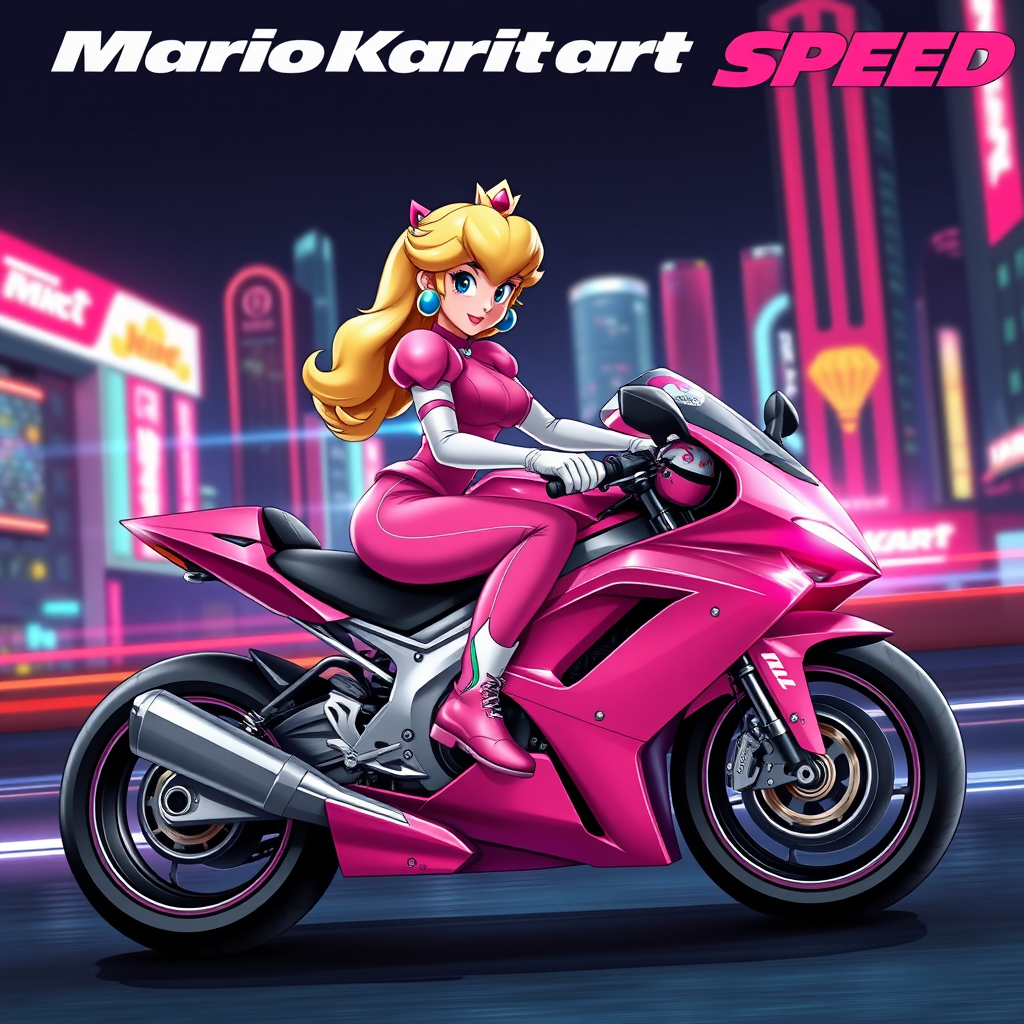A breathtaking, ultra-realistic image of Princess Peach on a sleek pink racing bike, inspired by Mario Kart and Fast and Furious aesthetics. She is dressed in a chic pink sports suit with white accents, holding a matching helmet in her right hand. The backdrop features a vibrant nighttime cityscape with neon lights, exuding a dark, fantasy ambiance. The text "Mario Kart SPEED" appears prominently at the top, enhancing the cinematic feel. The high-resolution image, combined with bold typography, offers an unforgettable visual. The illustration is detailed and clearly defined, while maintaining a sense of dynamic motion and energy.