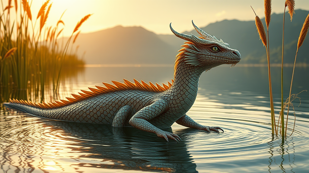 A breathtaking ultra-realistic photograph captures a mesmerizing anthropomorphic female dragon gracefully emerging from the serene water of a crystal-clear lake. Her scales glisten with a subtle iridescent glow under the golden sunlight, showcasing intricate patterns and textures that exhibit hyper-realistic detail. The composition is harmonious and captivating, with tall, swaying reeds framing the scene and gentle ripples spreading from her elegantly clawed feet. Her eyes, wise and profound, reflect a spectrum of colors as they gaze into the distance, evoking an overwhelming sense of admiration. The vivid greenery and distant mountains add depth to the hyper-detailed image, all rendered in an astonishingly lifelike 32k UHD resolution.