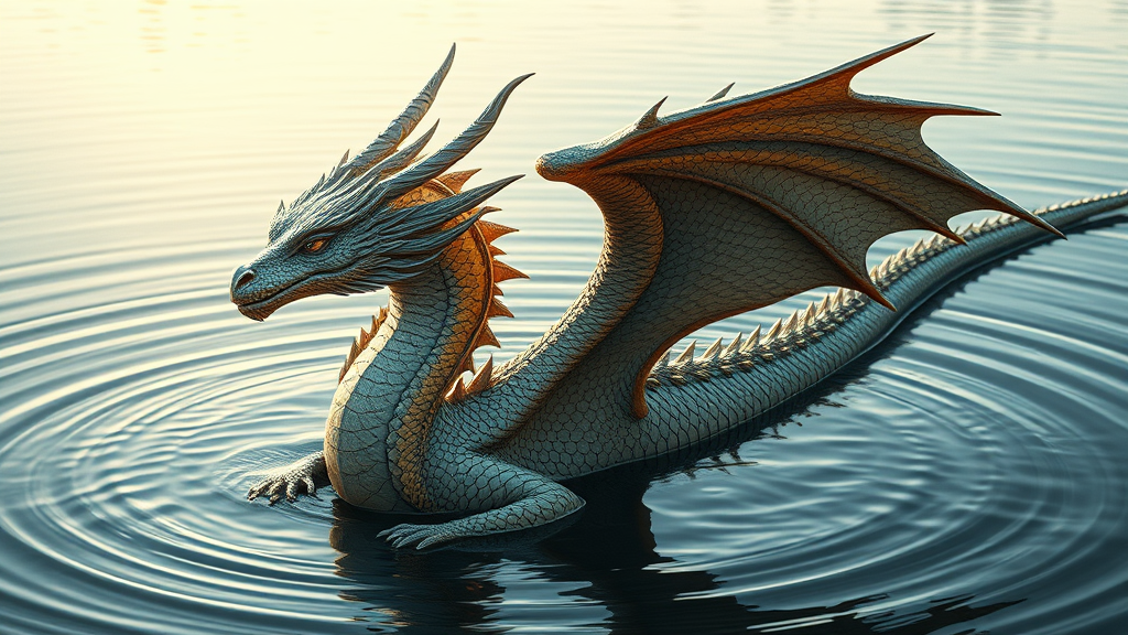 A breathtaking ultra-realistic photograph captures a magnificent anthropomorphic female dragon gracefully emerging from a serene lake, her scales glistening in the gentle sunlight. Her expressive eyes reflect wisdom and power, while intricate patterns adorn her majestic wings, partially unfurled to create a mesmerizing silhouette. The composition masterfully evokes a profound sense of admiration, with hyper-detailed textures emphasizing her elegant form and the surrounding ripples in the water. This 32k UHD resolution image immerses the viewer in an enchanting, otherworldly scene, where the borders between myth and reality blur in awe-inspiring beauty.