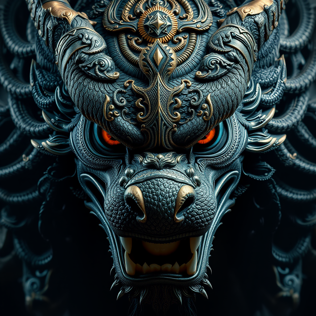 A breathtaking, ultra-realistic portrayal of a fierce singha, its gaze piercing as it faces directly forward. The image is saturated with intricate details, capturing the mythical essence of Thailand's lore. Elements of dragoncore weave through the design, giving it a dark fantasy allure reminiscent of Antonio J. Manzanedo's style. The composition is masterfully arranged, with every feature meticulously crafted to convey power and mysticism.