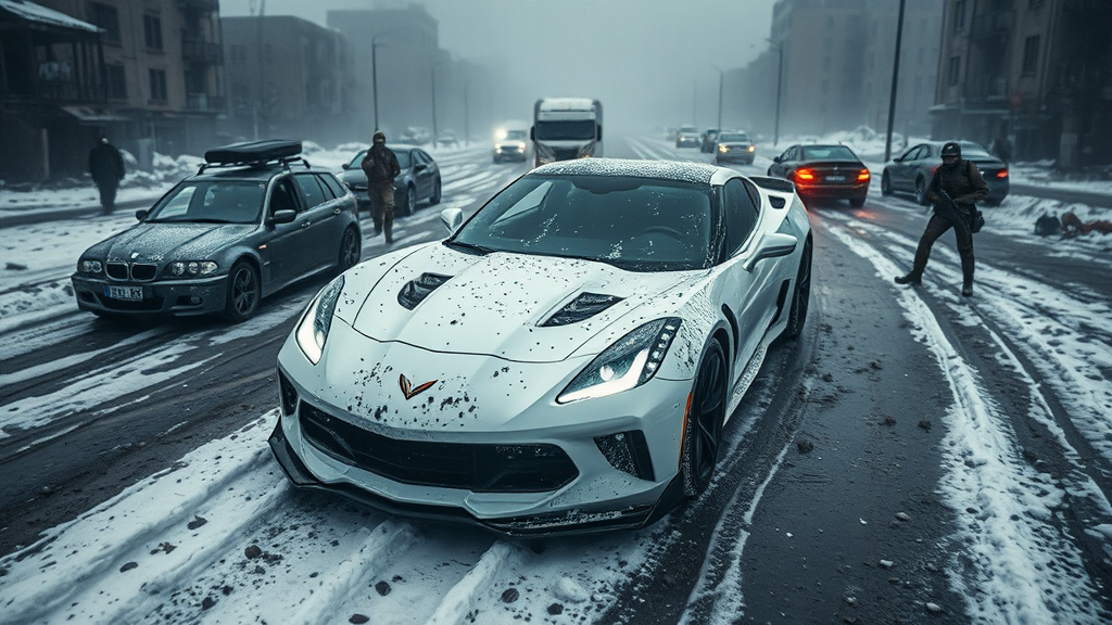 A breathtaking view of a utopian car with white paint, set against the backdrop of a ravaged cityscape. The scene captures an ultra-realistic moment with high contrast, enhanced by a layer of fog that adds an air of mystery. Snow and mud caked on the sleek surface, while LED lights glow vividly, showcasing the superb materials used in its design. Despite the challenging environment, the car's elegance stands out, surrounded by other vehicles and soldiers on the ground. This top-level focal point is viewed from a bird's eye perspective, as if captured by a drone, lending a hyperrealistic and hyperdetailed quality. The analog style hints at an almost nostalgic film photography look, complete with a large depth of field and masterful use of light and shadow. The scene is harmonious, adhering to the golden ratio, and emphasizes intricate and high-detail visuals, resulting in a masterpiece of ultra-realistic artistry.