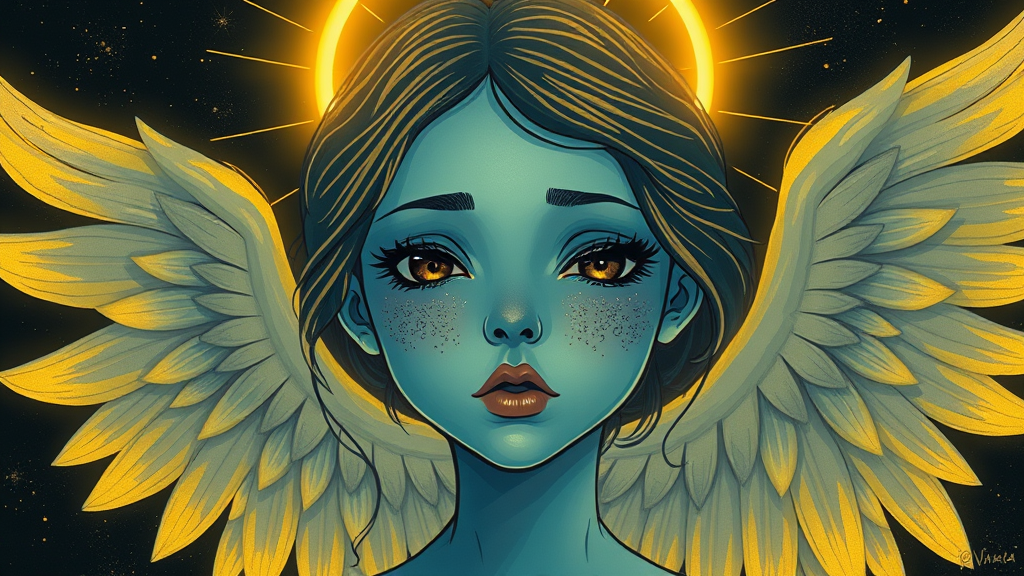 A breathtaking vision of a blue-skinned girl adorned with a radiant gold angel halo, rendered in neon realism. The pièce de résistance, darkly romantic illustrations with hints of dark white and warm yellow tones, guides you through a solarpunk dreamscape. The simplistic cartoon style enhances her ethereal beauty, exuding a brooding mood that captivates the senses.