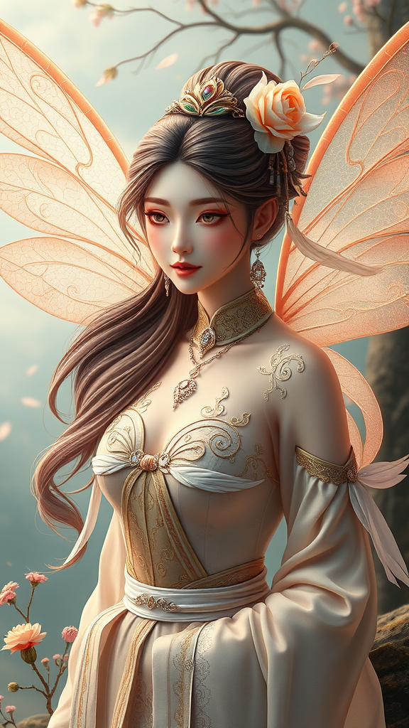 A breathtaking vision of a Chinese fairy with intricate, realistic features and flawless skin texture, adorned in a stunning, elegant ensemble. Her ethereal presence is complemented by delicate, shimmering wings and an aura that blends nature and grace. The fairy's eyes sparkle with an ancient wisdom, and her hair flows like liquid silk, capturing the essence of both beauty and mysticism. Delicate, ornate jewelry enhances her regal appearance, and she stands amidst a serene, otherworldly landscape that mirrors the tranquil enchantment she embodies.