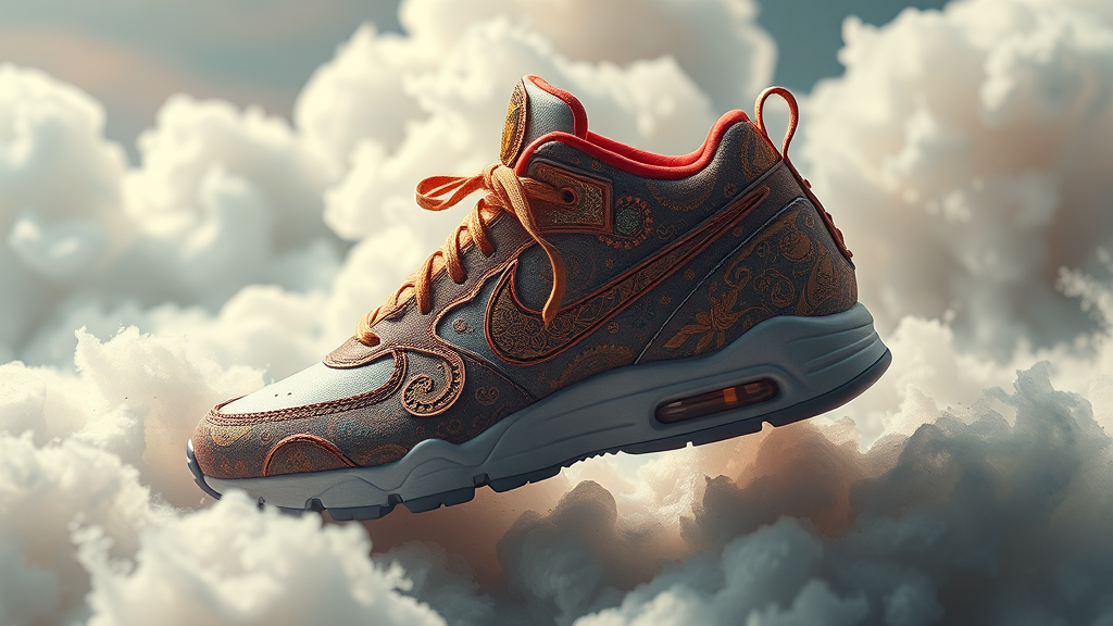 A breathtaking vision of a Nike sneaker, crafted into an artistic masterpiece, this advertisement showcases an exceptionally detailed and ornate design. With a hypermaximalist approach, the imagery exudes luxury and cinematic appeal, reminiscent of the works of CGSociety. Influences of James Jean’s intricate detailing, Brian Froud’s whimsical elements, and Ross Tran’s vibrant energy merge seamlessly, creating a piece that pushes the boundaries of creativity in shoe design. The composition utilizes a 4:5 aspect ratio to emphasize its grandeur and depth, capturing the viewer's imagination and setting a new standard in footwear artistry.