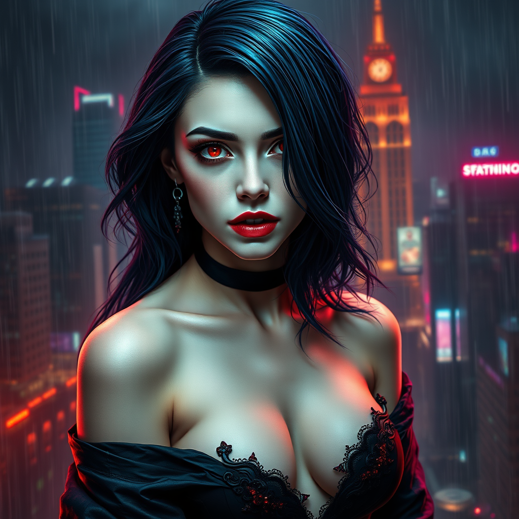 A breathtaking vision of a sensuous woman with alabaster skin and cascading dark blue hair, captivating crimson red eyes that exude a charismatic allure befitting a queen vampiress. She embodies a gothic elegance, wrapped in a cloak of dark, morbid mystery. Her presence is atmospheric, evoking visions of dramatic, rain-soaked settings with an epic intensity. The air is thick and dense, with an almost tangible humidity that clings to her skin, accentuating her hyperornate, femme fatale allure. This glamour shot is passionate and incredibly detailed, offering a photorealistic, full-body portrait rendered with octane precision. Set against the backdrop of a behemoth cityscape that shimmers with vaporwave and psychedelic hues, the scene is enlivened by cinematic, volumetric lighting that enhances the surreal, CGI realism, creating a juxtaposition of timeless beauty in a modern, hyper-stylized world.
