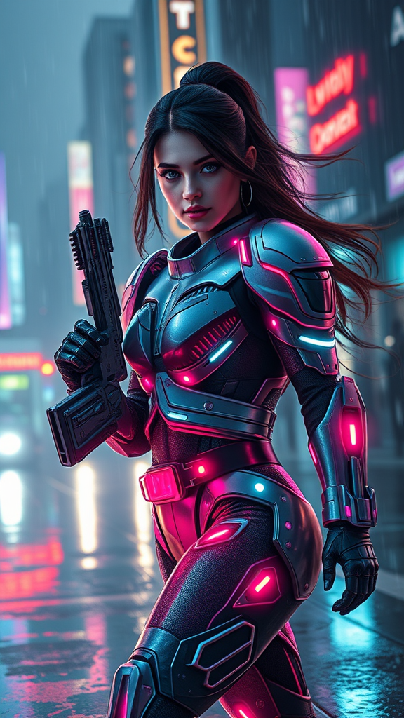 A breathtaking vision of a young girl, exuding an ethereal beauty reminiscent of a goddess, clad in sleek sci-fi medium armor adorned with vibrant neon lights. Her eyes, pure white, radiate confidence as she strides through an urban landscape, captured in dramatic slow motion amidst glowing rain and vibrant neon reflections. She wields a futuristic laser gun, her figure highlighted by a stunning interplay of latex and intricate detailing, reminiscent of Star Wars' futuristic aesthetics. Her perfectly symmetrical face bears a confident smile, her dynamic hairstyle flowing with graceful nostalgia. The intricacies of her HDR skin are captured in photorealistic detail, with cinematic lens flares enhancing the scene. Her presence is a cyberpunk masterpiece, inspired by the dynamic art styles of luminaries like Artgerm, Greg Rutkowski, and Viktoria Gavrilenko. Set against an atmospheric backdrop of fog and detailed reflections, she embodies strength and poise, a symbol of futuristic elegance, trending on ArtStation and CGSociety.