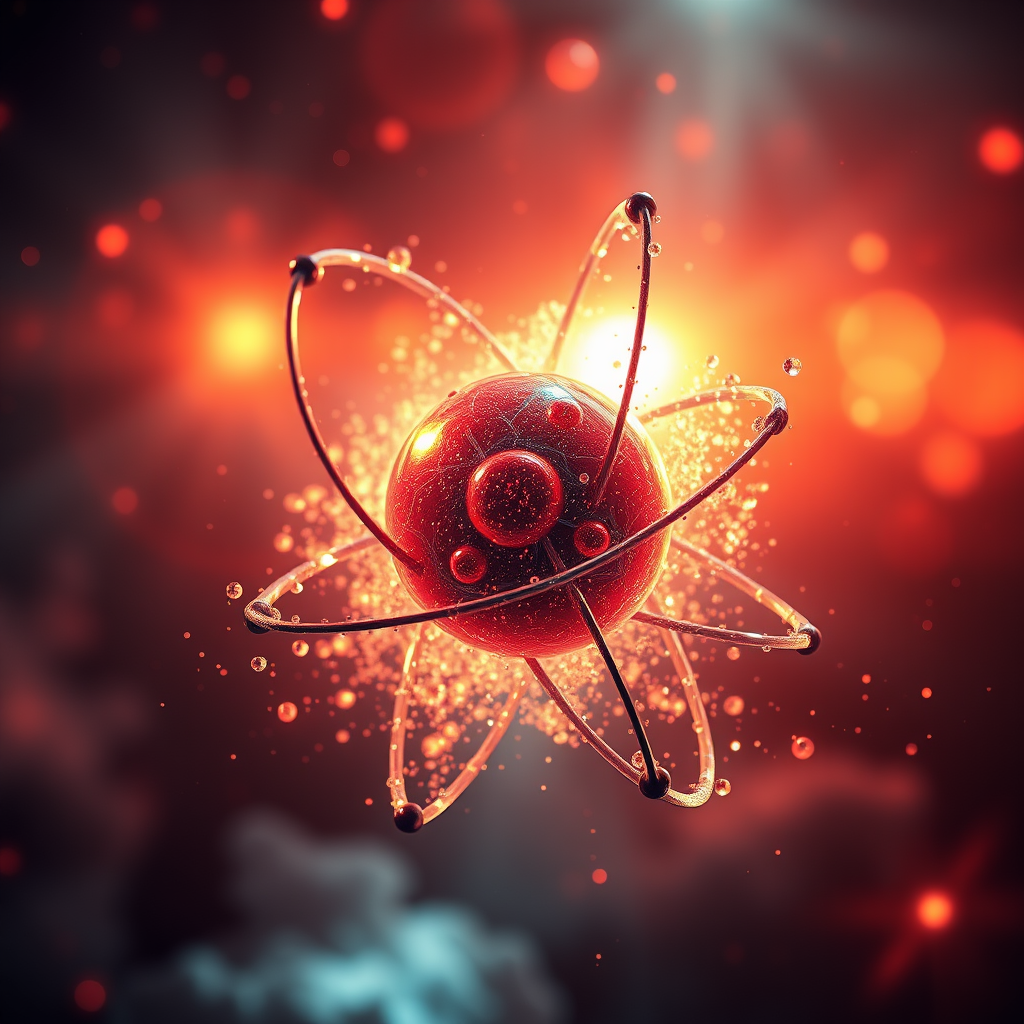 A breathtaking vision of an atom with a mesmerizing nucleus of protons and neutrons enveloped by a shimmering cloud of electrons, set in a futuristic realm. It captures dramatic and cinematic colors in a professional composition, highlighting stunning, massive detail. The scene exudes romance and inspiration, with clarity and perfection in light. This surreal and novel artistic portrayal features sharp focus and elaborate design, showcasing harmony and creativity in rich, deep hues. The result is a fine, epic masterpiece of symmetry and elegance.