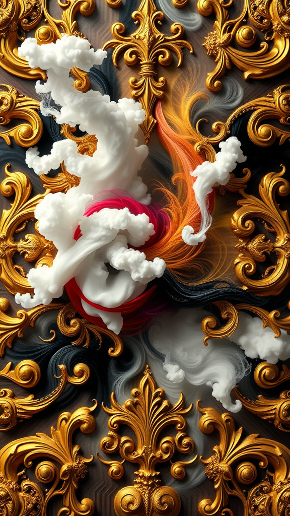 A breathtaking vision of future growth emerges through dramatic and elaborately emotive Golden Baroque and Rococo styles, where transcendent beauty is woven into a seamless pattern featuring large, symmetrical motifs reminiscent of the Sistine Chapel ceiling. In 8k, the image is rendered in supersharp detail with spirals and swirls in the Rococo style, adorned with cartouches. The scene is infused with white smoke and rainbow ink swirling through water, while gold, black, and rainbow colors intertwine in perfect symmetry. The 3D composition boasts a photorealistic quality, with intricate, jaw-dropping detail highlighted by cinematic lighting, captured in an Octane render that enhances the epic feel of this striking visual masterpiece.