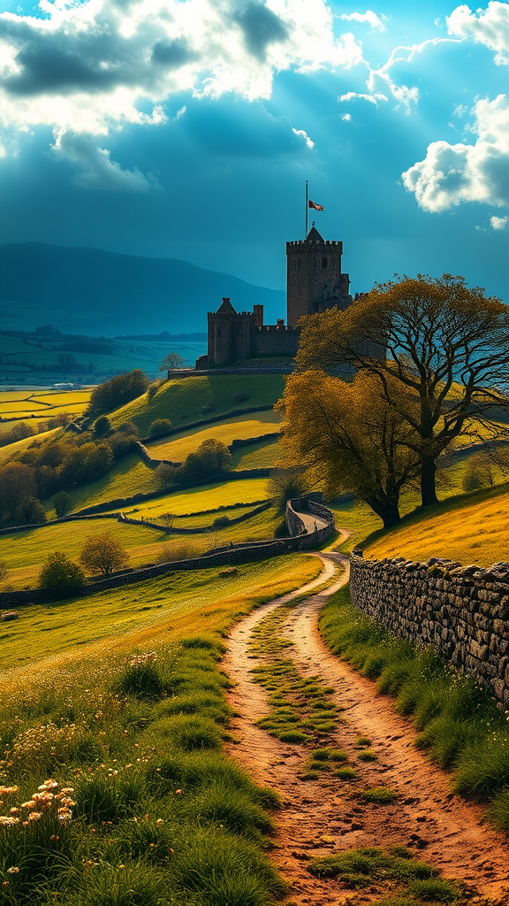 A breathtaking vista of a medieval countryside unfolds before the viewer, with an imposing English castle standing majestically in the distance under a dramatic sky. The landscape is captured in hyper-realistic detail, evoking the rich textures and vibrant colors reminiscent of a Carr Clifton photograph. The scene is rendered in cinematic 8k resolution, showcasing the beauty of rolling hills and lush meadows dotted with wildflowers. Ancient oak trees line a winding dirt path, guiding the eye toward the castle’s towering spires. This epic composition is bathed in golden sunlight, creating an atmospheric glow that enhances the texture of ancient stone walls and vibrant greenery, reminiscent of an octane render, a masterpiece of landscape art that could grace any Artstation gallery.