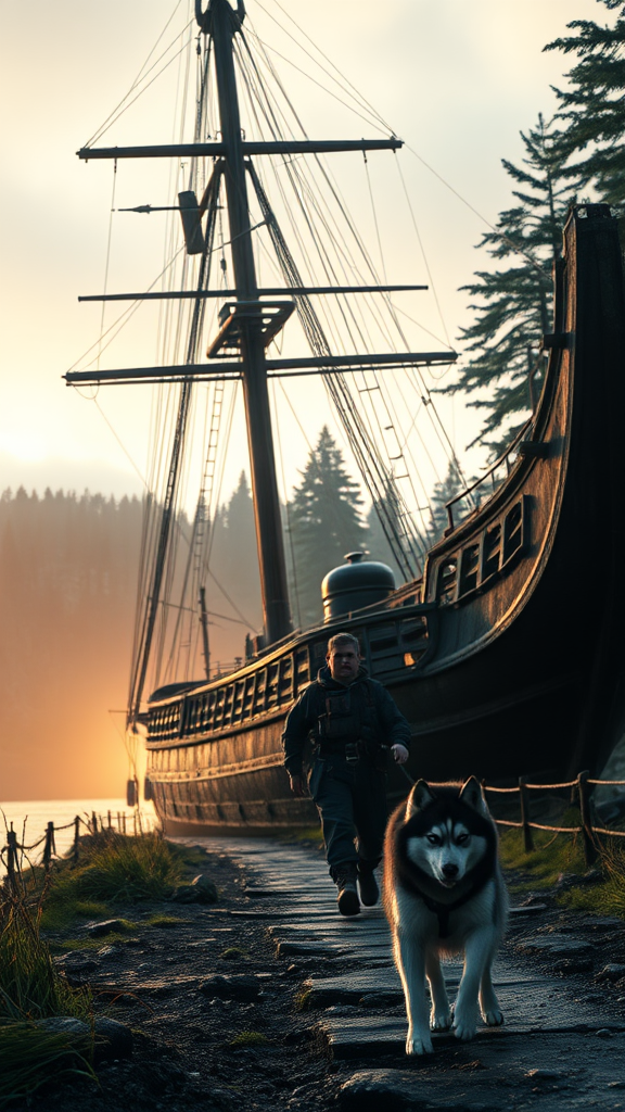 A breathtaking visual of an ultra-detailed sailing ship, captured in a dramatic low-angle shot during a pale sunrise. The cinematic lighting highlights the ship's weathered textures, evoking a sense of historical grandeur, with intricate detailing reminiscent of John William Turner's masterpieces. Inspired by Studio Ghibli's artistry, the scene blends hyper-realism with fantasy, as realized through Unreal Engine 5. Nearby, a middle-aged man with short, salt-and-pepper hair and an average build is seen walking away, adorned in rugged exploration gear, accompanied by a vigilant Siberian husky. They are on a slightly rugged path toward a sprawling Patagonian forest, where towering trees loom in the distance. Soft, diffused light from an overcast sky filters through the lush greenery, casting an atmospheric glow on the scene. The husky's fur gleams subtly under the natural illumination, capturing its alertness. The image exudes the untouched beauty and adventurous spirit of Patagonia, highlighting the intricate textures of the manβs attire, the dog's fur, and the encompassing wilderness, all portrayed in cinematic composition with realistic color tones.