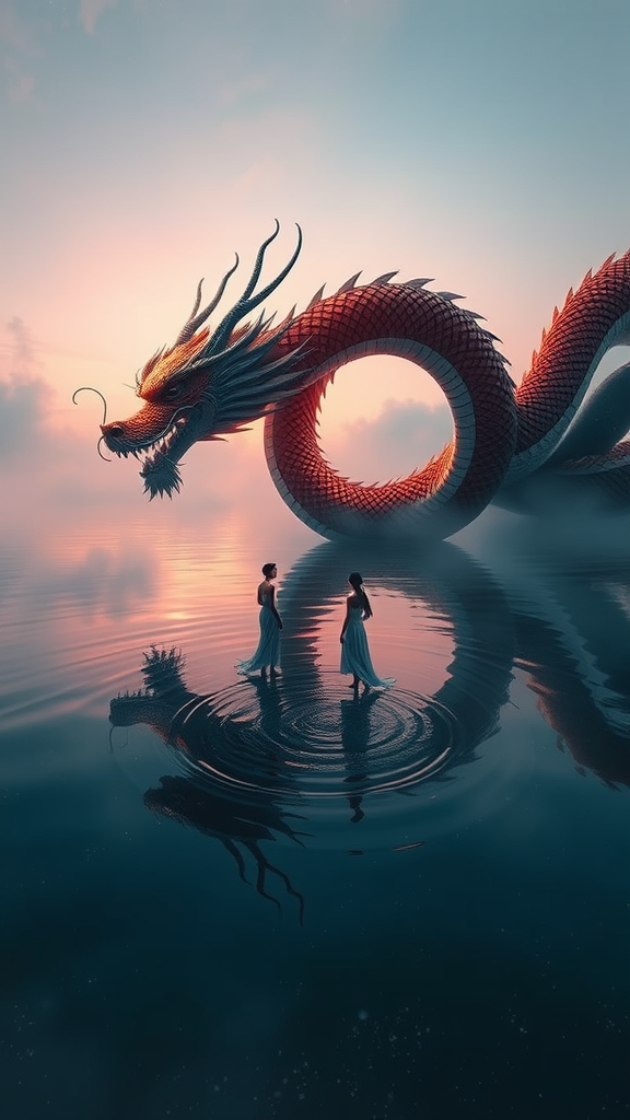 A breathtaking wide-angle scene featuring a lone figure standing gracefully in serene waters beside an awe-inspiring Chinese dragon, rendered in fantasy style with realistic detail. The composition captures the ethereal essence of the moment, inspired by artists such as Theo Prins and Evgeni Gordiets. The scene boasts 8k sharp focus and photorealism, with the water rippling around the woman's feet and the dragon's scales gleaming in the fading light. Lush, vibrant colors and intricate textures enhance the magical realism of the setting, while the dragon's majestic, sinuous form arcs elegantly through the mist. The sky holds a twilight hue, reflecting on the water's surface. The scene evokes a sense of harmony and mystery, drawing inspiration from Kuang Hong's fantastical landscapes and the cinematic essence of Ferrania P30. The overall composition is balanced and centered, with precise anatomy and lifelike expressions, ensuring a beautiful and captivating visual story.
