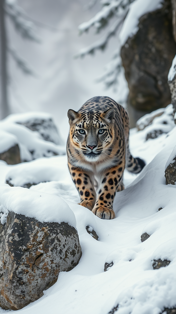 A breathtaking wildlife photograph captures a snow leopard stealthily prowling through a snow-laden rocky terrain in a mist-shrouded mountain forest on a wintry day. The leopard's full body is visible, its exquisitely detailed fur camouflaged against the pristine landscape. Its piercing eyes lock onto the viewer with a predatory intensity, showcasing hyper-defined, vivid detail. The scene is captured in sharp focus with natural lighting enhancing the textures and patterns, creating a striking visual contrast in this high-resolution, award-worthy composition.