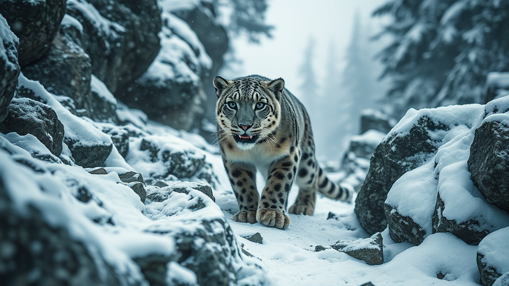 A breathtaking wildlife photograph capturing a snow leopard as it stealthily maneuvers through a snowy rocky mountain terrain, its full body on display amidst a dense forest shrouded in the subtle ambiance of an overcast day. The snow blankets the rocky surroundings, and the leopard's thick fur blends seamlessly with the environment. With an intense gaze directed straight at the viewer, its predatory nature is palpable. The photo's meticulous attention to detail highlights every whisker and fur pattern, particularly its mesmerizing, hyper-detailed eyes. The image is in strikingly high resolution with impeccable clarity, enhanced by the natural lighting that casts a gentle glow on the scene, creating an awe-inspiring and immersive visual experience. The proportions are subtly altered to fit a cinematic landscape ratio.