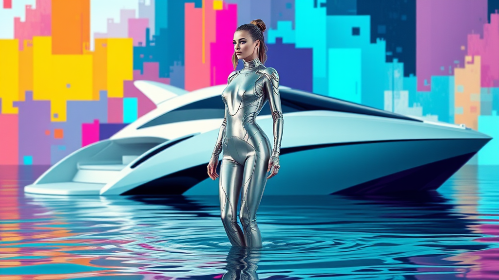 A breathtaking woman stands gracefully in water beside a sleek, ultramodern boat, exuding colorful futurism with her avant-garde costume design. Her attire combines a sleek metallic finish with elegant robotic motifs, invoking a futuristic rococo pastel aesthetic. Surrounding her, vivid color blocks create a dynamic and vibrant visual spectacle, reminiscent of digital art. Her posture is poised and confident, with each detail of her futuristic ensemble meticulously crafted, highlighting a harmonious blend of technology and high fashion. The backdrop of the scene is an abstract interplay of colors and reflections, enhancing the sleek, forward-thinking atmosphere.