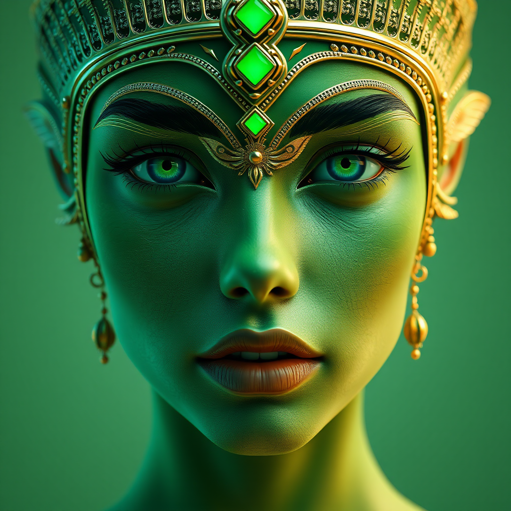 A breathtaking young female face with a harmonious balance inspired by the golden ratio, embodying an exquisite green aesthetic. The visage is symmetrical and elegantly designed, exuding luxury and crafted with ultra-realistic precision. Concept art that is intricately detailed and photorealistic, featuring an 8k resolution achieved through octane render and advanced techniques of the unreal engine. The face is illuminated by ethereal volumetric lighting, reminiscent of masterpieces by Artgerm, Greg Rutkowski, Alphonse Mucha, and Vraska Golgari. This striking portrait showcases intricate Egyptian art-infused makeup with a touch of Christian W. Staudinger's distinctive style, reimagined by the visionary effects of Industrial Light and Magic. A close-up highlights the makeup details and character, presented with a shallow depth of field and sharp focus, evoking the grandeur of a Behance contest winner, blending the allure of video art and the captivating surrealism of a freakshow.