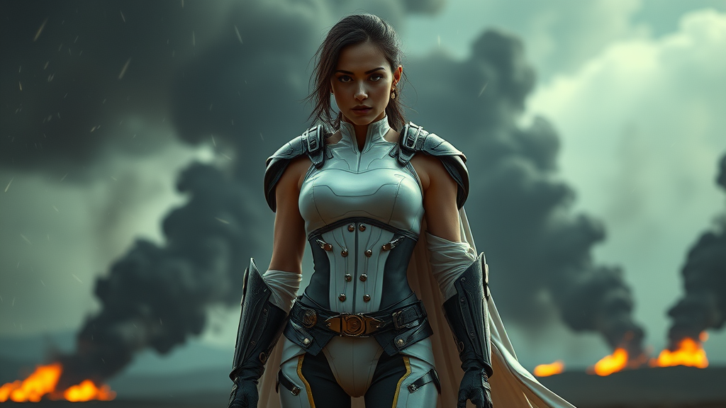A breathtaking young woman with a slim, athletic build and a stunning, aristocratic face stands in glossy sci-fi battle armor reminiscent of Ghost In The Shell. She wears a tight, white jumpsuit paired with armored leggings, and a dense cloak billows around her. Her expression is a mix of arrogance and innocence, captivating yet commanding attention. The dramatic scene unfolds amidst a meteor shower, with black smoke rising from distant fires under heavy thunderclouds. Reflections of the fires dance across her armor, creating a hyper-realistic, cinematic atmosphere full of tension and intensity. The lighting is naturally textured and stained, with dramatic highlights and gold accents illuminating her corset and rivets. Her bare arms and neck add to the striking silhouette, set against a crushingly gloomy backdrop. The composition is balanced and symmetrical, avoiding any distortions or unrealistic elements, ensuring flawless anatomy and proportions.