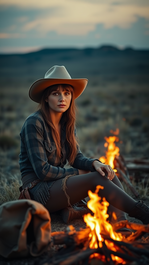 A breathtakingly beautiful female cowboy sits by a flickering campfire on the open prairie, surrounded by the vast expanse of the western landscape. The scene captures a cinematic quality with ultra-sharp focus, showcasing the serene and rugged terrain of the borderlands. The details of the setting and her relaxed posture tell a captivating story of life on the prairie. Her expression reflects a deep connection to the land and the wild spirit of the frontier. The visual is highly detailed, presenting a clear and stunning picture of her character, free from any imperfections or visual disturbances, focusing purely on her presence and the natural beauty around her.