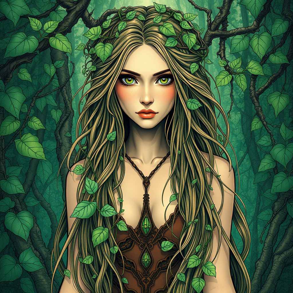 A breathtakingly beautiful female druid stands centered deep within a vibrant forest, the intricate and highly detailed surroundings echoing the artistry of Carne Griffiths and Conrad Roset. Her presence is both ethereal and mesmerizing, with an air of wisdom and connection to nature. Vines and leaves weave seamlessly into her long flowing hair, cascading around her shoulders like a natural crown. Her eyes are a striking focal point, reflecting the lush greens and earthy browns of her environment. Delicate linework highlights her graceful form, adorned with a simple, elegant necklace that seems to pulse with the energy of the forest itself. This comprehensive cinematic scene captures her as an embodiment of nature's beauty and power, standing as a timeless guardian of the woodland realm.