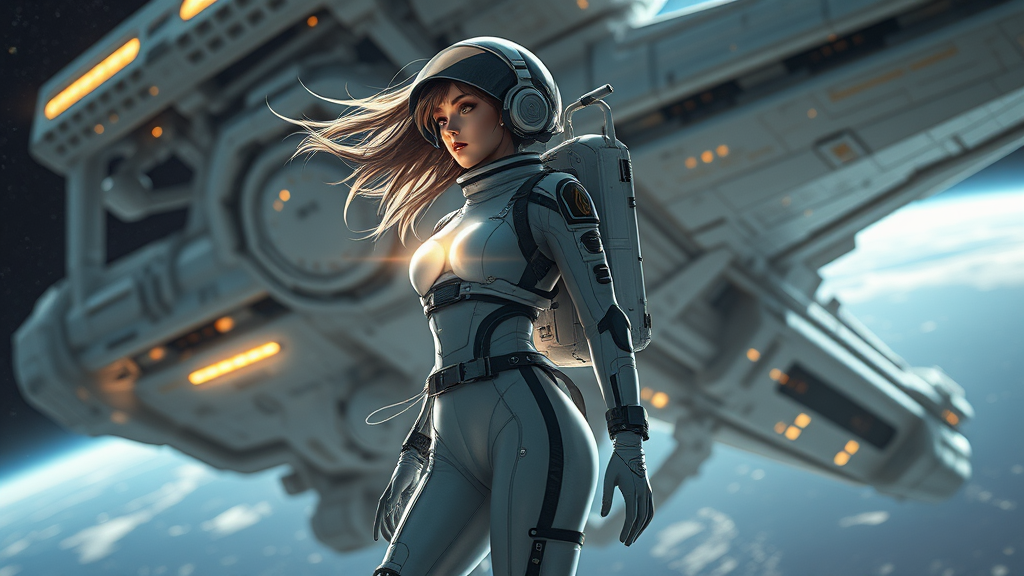 A breathtakingly beautiful girl dons a sleek spacesuit, set against the sprawling backdrop of a colossal, hyper-detailed sci-fi spacecraft. Inspired by the styles of Tsutomu Nihei and the aesthetic of Sidonia no Kishi, the scene is rendered with stunning clarity and cinematic lighting. Her hair flows dynamically as if caught in a cosmic breeze. Her form is illuminated with a subtle glow; light emanates from her chest, highlighting accessories like her helmet, piercing, and headphones. Her slender silhouette is elegantly accentuated by narrow hips and heels, with hints of gold detailing throughout the suit. The spaceship, a masterpiece of minimalistic epic design, serves as a perfect contrasting backdrop. The overall composition blends symmetry with intriguing elements to create a surreal yet harmonious visual experience.
