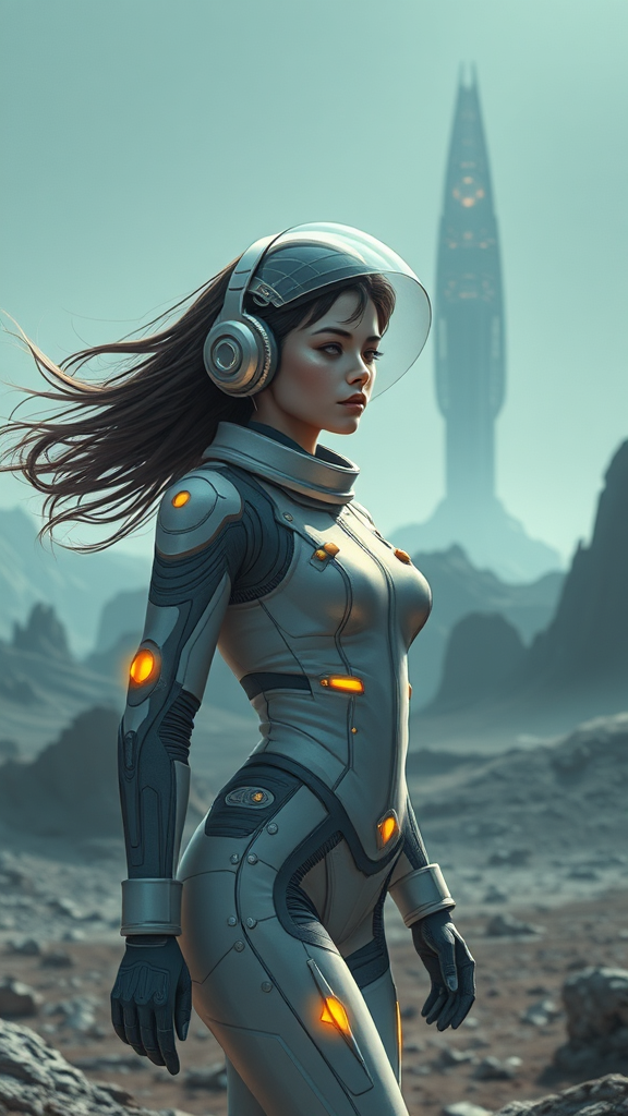 A breathtakingly beautiful girl in a sleek spacesuit stands amidst the vastness of a hyper-detailed, minimalistic sci-fi landscape, evoking the style of Tsutomu Nihei and Sidonia no Kishi. The single colossal spaceship in the background is constructed with intricate detail, exuding an air of epic grandeur. Her hair flows dynamically in the cinematic lighting while her helmet and the lighted elements on her suit create a glowing effect. The suit features shimmering gold accents and rivets, conforming to her slender figure with elegance. Her piercing and headphones add a modern touch, while the intricate details of the design suggest sophistication and advanced technology. The composition captures a balance of symmetry and dynamic energy, blending the stark beauty of sci-fi aesthetics with the compelling elegance of the character.