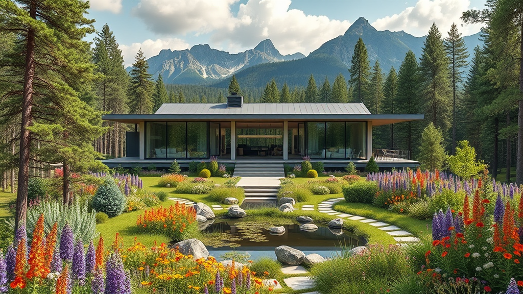 A breathtakingly beautiful home in the heart of a lush forest, designed in the clean and elegant fashion of Scandinavian modernism, seamlessly blending with nature. It offers sweeping panoramic views of majestic mountains and boasts an expansive, vibrant garden brimming with colorful wildflowers. The architecture is ultra-realistic, crafted in 3D with meticulous detail, capturing the essence of modern design amidst serene natural surroundings. The house features large glass windows that allow natural light to flood the interiors, creating a harmonious connection with the outdoors. A tranquil pond and winding stone paths add an element of Zen to the garden, enhancing its picturesque landscape.