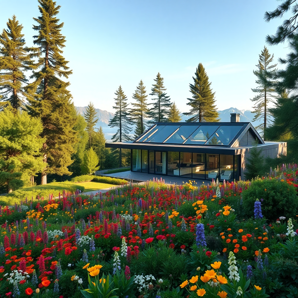 A breathtakingly beautiful house embodying the essence of Scandinavian modernism nestled amidst a lush forest teeming with towering trees and vibrant plants, offering a mesmerizing panoramic view of distant mountains. The property boasts an expansive, colorful flower garden that bursts with life and creates a seamless blend between architecture and nature. The design features sleek, minimalist lines and large glass windows that invite the outside in, allowing natural light to flood the interiors while providing spectacular views of the surrounding landscape. The house is an architectural masterpiece, combining sustainable materials with elegant simplicity, creating a serene and harmonious sanctuary in the heart of nature, rendered in ultra-realistic 4K, 3D design.