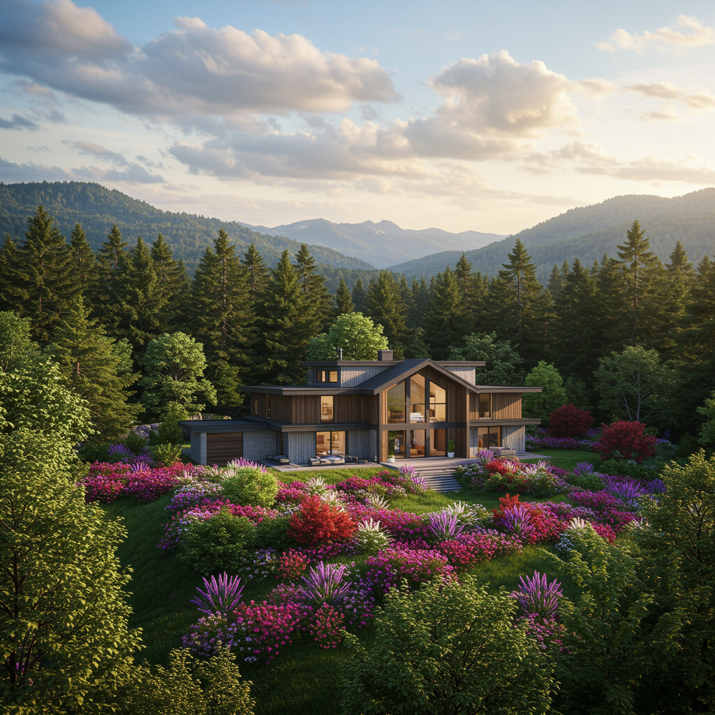 A breathtakingly beautiful house in Scandinavian modernism style nestled within a lush forest, surrounded by towering trees and abundant greenery, offering an incredible panoramic view of the distant mountains. The property features expansive, vibrant flower gardens in a riot of colors, creating a stunning contrast against the minimalist architecture. The ultra-realistic design includes floor-to-ceiling windows that invite the outdoors in, seamlessly blending natural beauty with modern elegance. The 3D architecture showcases clean lines and functional spaces that harmonize with the serene, natural surroundings.