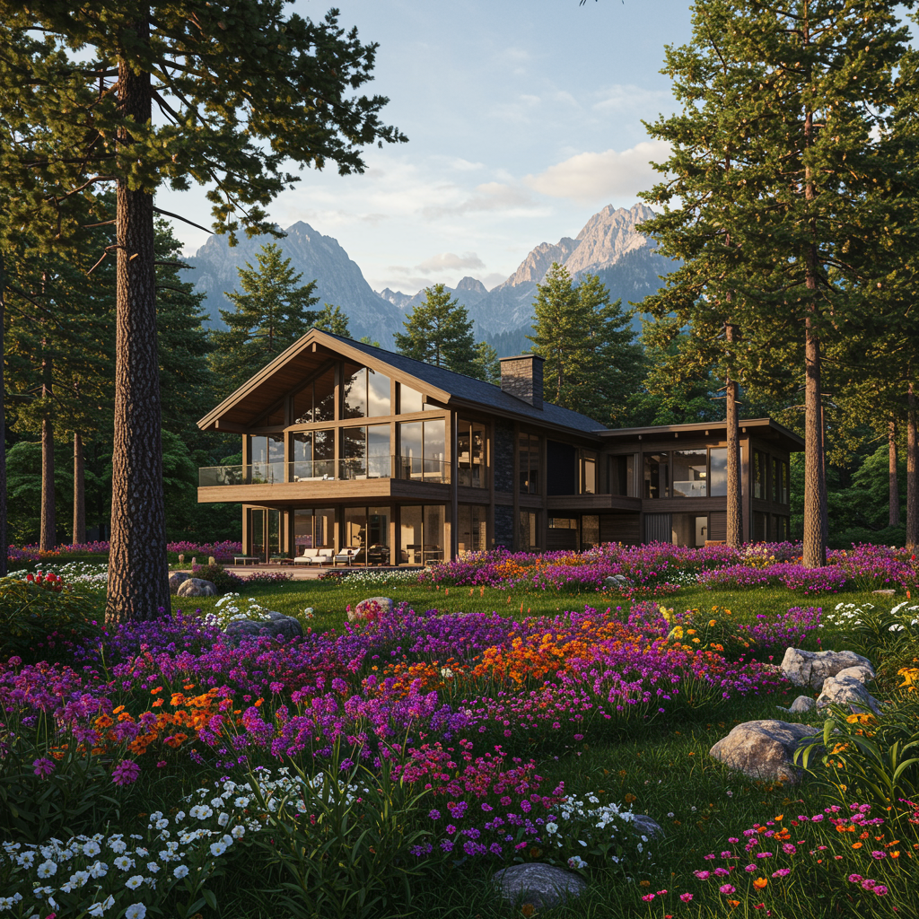 A breathtakingly beautiful house in the style of Scandinavian modernism nestled within a lush forest, surrounded by towering trees and vibrant greenery, offering an incomparable view of majestic mountains. The property features an expansive, colorful flower garden that seamlessly blends with the natural landscape. The ultra-realistic design incorporates expansive glass panels that invite the serene outdoor beauty inside, and the structure's clean lines and natural materials harmonize effortlessly with its environment. The scene is depicted in stunning 4K, 3D, capturing every intricate detail of this architectural masterpiece.