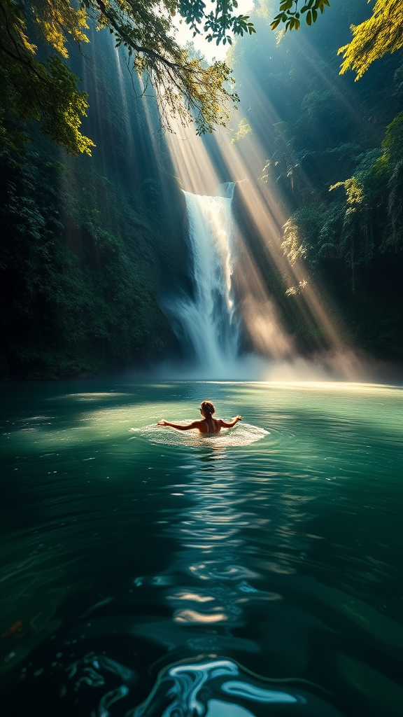A breathtakingly beautiful photograph captures a woman gracefully swimming in a serene lake nestled within a lush jungle, near a cascading waterfall. Mist swirls through the scene, illuminated by dramatic volumetric lighting that highlights the intricate details and vibrant colors of the landscape. Dappled sunlight filters through the dense canopy above, casting ethereal patterns on the water's surface. The composition centers on the woman, embodying elegance and artistry reminiscent of Carne Griffiths and Conrad Roset. The image evokes a cinematic quality, emphasizing stunning natural beauty and serenity, while maintaining a harmonious balance and precise attention to detail. Despite some artistic imperfections, the overwhelming sense of wonder and tranquility prevails in this captivating visual narrative.