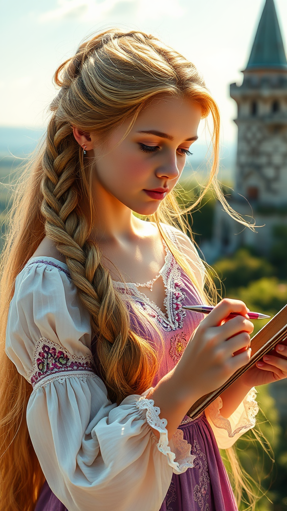 A breathtakingly beautiful Rapunzel with flowing golden hair intricately braided, capturing the elegance of a real-life girl as she artfully sketches her enchanting tower, set in stunning ultra-realistic 8k resolution. Bathed in natural sunlight, the scene exudes warmth and glow, emphasizing her delicate features. With an epic composition that embodies photorealism and masterful detail, a gentle breeze stirs her braid, and the lush landscape surrounding her comes alive with vibrant colors, creating a serene yet dynamic atmosphere.
