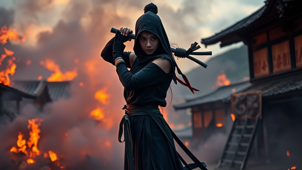 A breathtakingly beautiful woman stands in the midst of a burning village, her authentic ninja uniform contrasting against the fiery backdrop. The smoke swirls around her full form as she strikes a dynamic and cinematic pose, embodying strength and grace. The scene is captured with highly detailed realism, enveloped in volumetric fog that adds a mysterious charm. With dusk settling in, cinematic lighting highlights her exquisite features, reminiscent of the styles of Artgerm and Anna Dittmann. In this captivating key visual, the atmosphere is intense and immersive, free of any distractions or imperfections. All elements come together to create a stunning and powerful image.