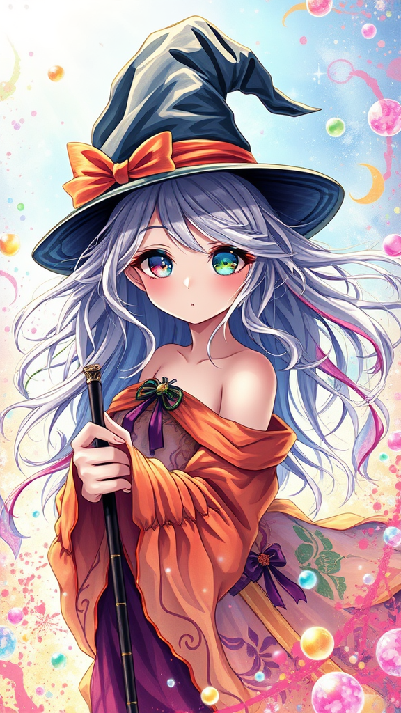 A breathtakingly delicate and stunning illustration showcasing a beautifully detailed girl with an enchanting presence. She dons a witch hat and wields a magical cane, her platinum and multicolored, disheveled hair floating effortlessly around her. Her vibrant eyes glisten with myriad colors, reflecting both mystery and allure. Her attire, a dazzling array of multicolored fabrics, complements the Halloween theme, shimmering under the sunlight. She appears amidst a cascade of colorful bubbles and a vivid background, animated with high saturation and bursts of color. The scene is alive with dynamic splashes, enhancing the magical, otherworldly ambiance.