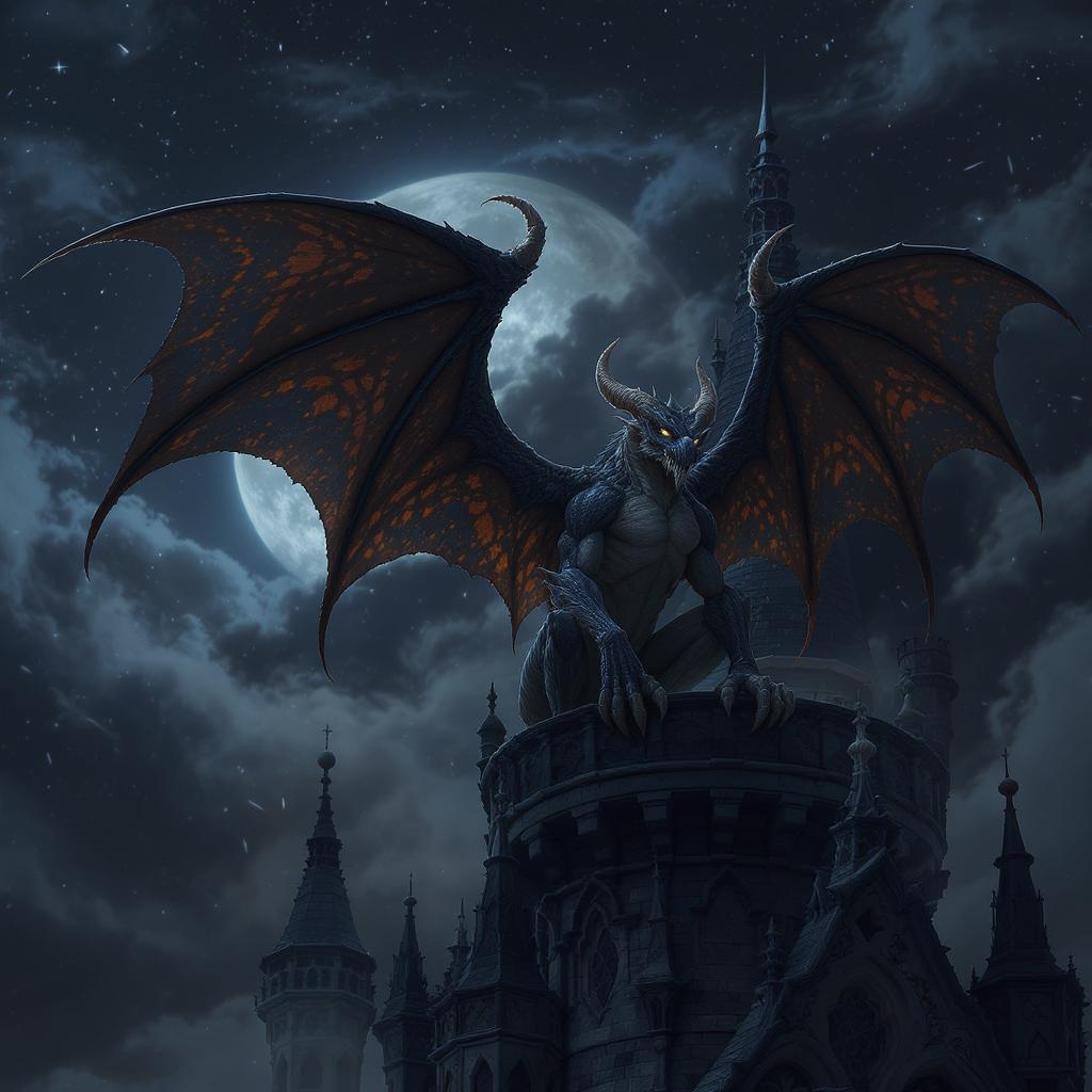 A breathtakingly detailed and beautifully crafted gargoyle with expansive wings perches gracefully atop the grandiose roof of a vast dark Gothic castle. This captivating figure exudes strength and elegance, striking a stunning pose against the night sky. The scene is crafted with exceptional artistry, utilizing vibrant colors and expressive stylized anatomy. This piece stands as a testament to creativity, featuring a well-developed, distinct personality and consistent style. Rendered using cutting-edge digital art techniques, including Adobe Photoshop, 3D Studio Max, and V-Ray, the composition reflects a professional and award-winning level of craftsmanship, reminiscent of the glibatree style with a unique twist.