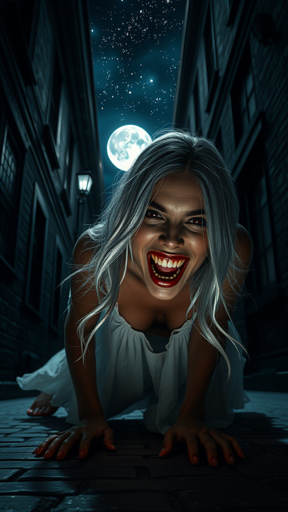 A breathtakingly detailed CG unity 8k wallpaper captures a mesmerizing portrait of a vampire woman lunging towards the viewer in a dimly lit Victorian back alley. Her long, flowing silver hair glows subtly under the moonlight, contrasting against her warm, bronzed skin. Her mouth is open wide, revealing gleaming vampire fangs poised to bite, with fresh blood dripping enticingly from her lips. She is clad in a tattered, ethereal white dress that clings to her form as she crawls deliberately on the cobblestone ground. The scene is bathed in dramatic, high-contrast lighting, amplifying the shadows and highlighting her predatory allure. Stars twinkle fiercely in the night sky above, while a luminous full moon casts its silvery glow over the eerie tableau, bringing a mystical quality to her haunting presence. The scene is infused with the signature style of an artwork by Greg Rutkowski, creating a vicarious sense of tension and beguilement in the cool night air.