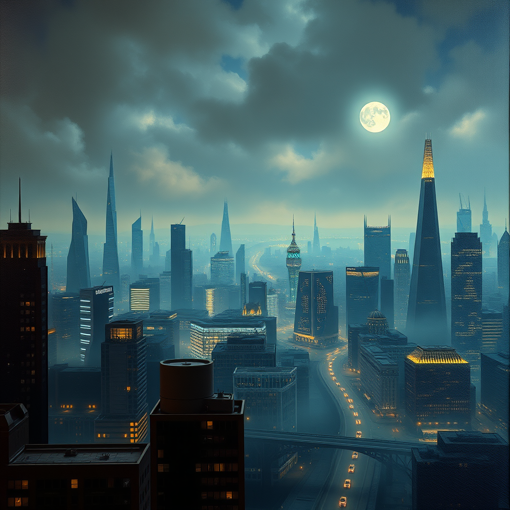 A breathtakingly detailed cityscape of the future under a serene moonlit sky, capturing the essence of a timeless oil painting with a London-inspired futuristic twist. The scene is viewed from a high angle, offering an intimate yet expansive perspective. The composition is meticulously balanced, revealing depth and complexity at every turn. Diffused ambient light creates a soft, voluminous glow, with strategic backlighting enhancing the visual drama. Paint transitions are smooth and seamless, while reflections dance elegantly across various surfaces, imparting a sense of life and movement. Features octane rendering for an ultra-realistic finish, with textures of the highest quality meticulously crafted to highlight the intricate details. The mystical atmosphere is palpable, and the air is filled with an enchanting, ethereal quality. This visual masterpiece, inspired by the finest modern landscape art, immerses you in a world where future meets tradition, and imagination knows no bounds.