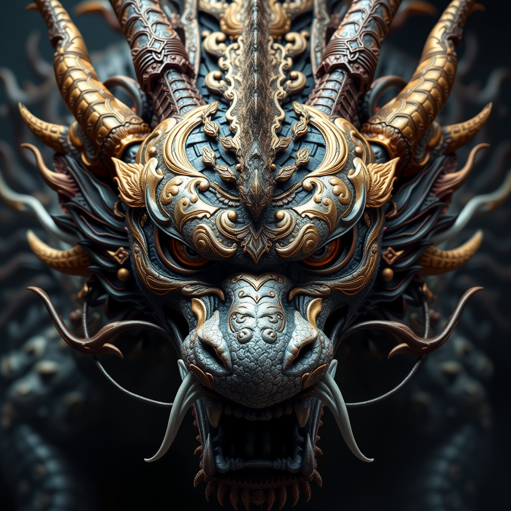 A breathtakingly detailed depiction of a ferocious Singha, captured head-on with intricate features, hyper-realistic textures, and extraordinary detail. Inspired by the rich mythology of Thailand, this creature blends fierce elegance with dragoncore elements, embodying a dark fantasy aesthetic reminiscent of Antonio J. Manzanedo's masterpieces. The composition is both awe-inspiring and meticulously crafted, drawing viewers into a realm where mythology and art collide, enveloped in a captivating atmosphere.